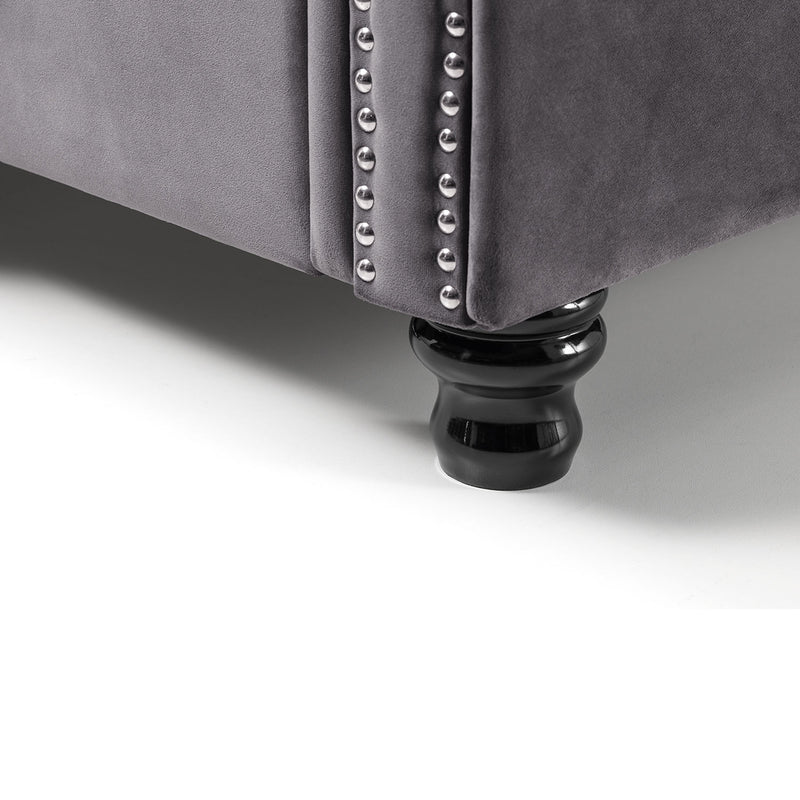 Oozing elegance, the Valentino bed is sure to be a luxurious focal point in any bedroom. This beautifully crafted bed offers a sophisticated sleigh design, upholstered in soft velvet fabric with classic button detailing and stylish studding.