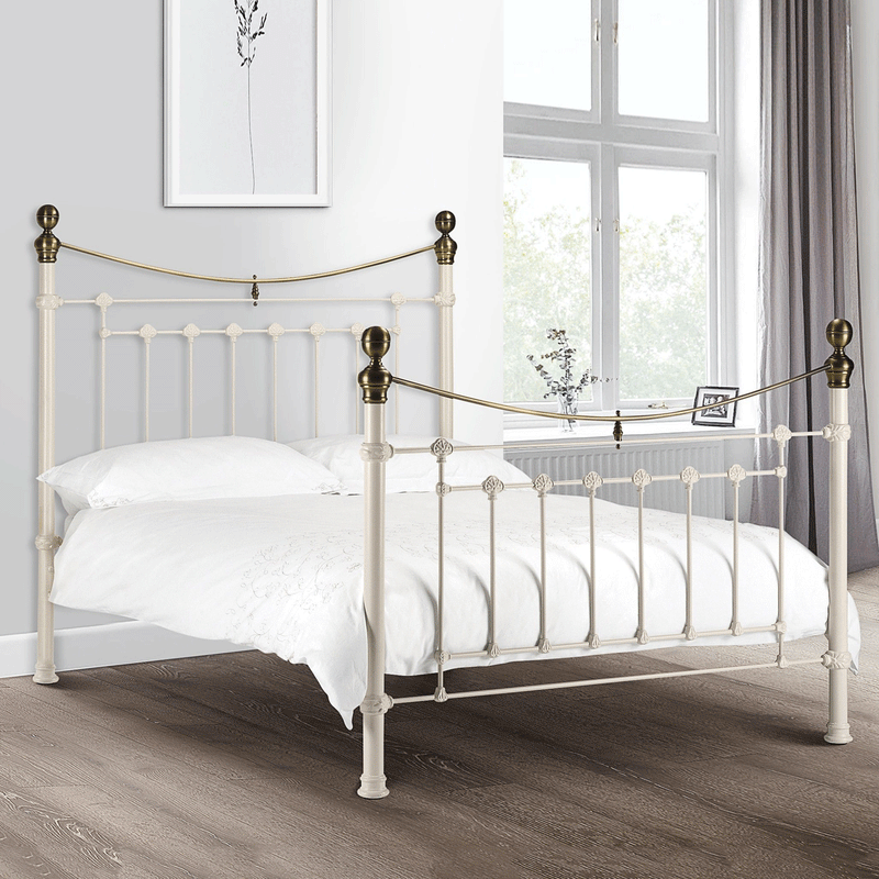 This is a traditional, Victorian-inspired bedstead with attractive brass embellishments in a powder-coated steel stone white and black finish.